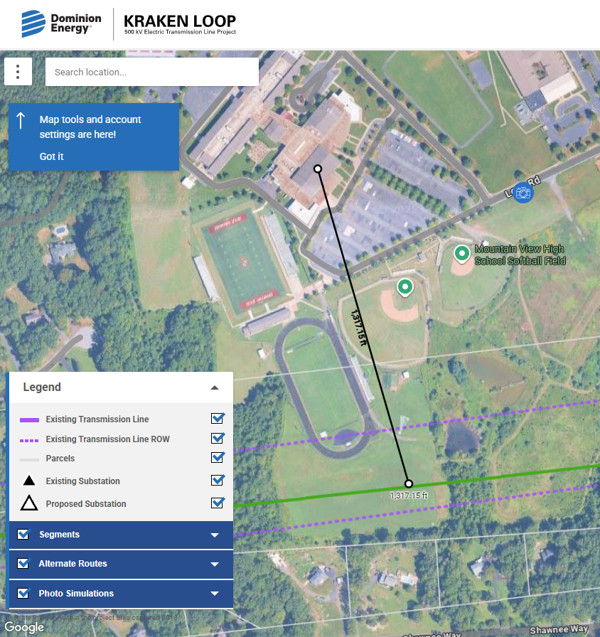 What Dominion didn’t show is that the first set of proposed lines is just 1300 feet from the cafeteria at MVHS.